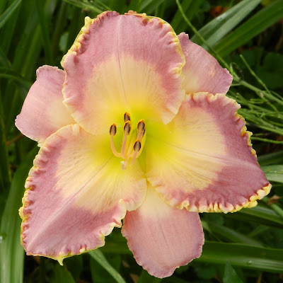 "Spiritual Corridor" has it all going: substance, heavy bud count, vigorous and beautiful. A 5 inch lavender pink with a prominent creamy yellow eye and matching picotee edge with a small chartreuse throat. Early to mid season. 25 inch scapes. Semi-evergreen. Hybridized by Hanson in 1992. I got this from Hornbaker Nursery in Princeton in 2010 and divided several times. If you want a show stopper on a budget, this beauty is your answer.